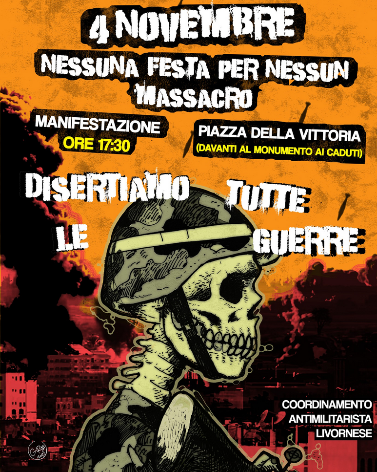 Scendiamo in piazza anche quest’anno il 4 novembe, “festa nazionale” in cui si celebrano le forze armate e la “vittoria” della prima guerra mondiale (1915-1918). Contro la celebrazione di una strage del passato che serve a giustificare le guerre di oggi.